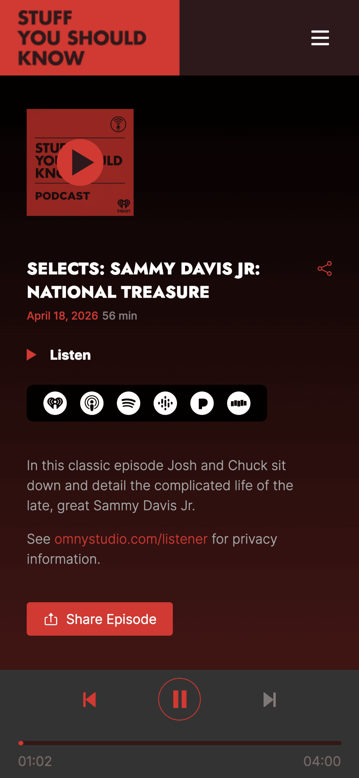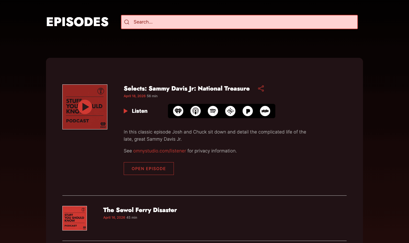 We designed and built a new digital home for Stuff You Should Know, with a persistent player, AI-powered episode search, and a tour calendar the team can manage themselves.